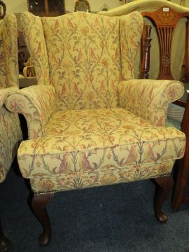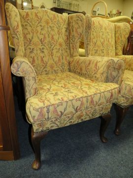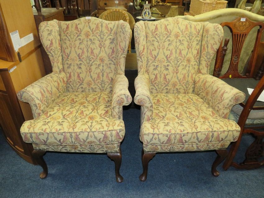 A PAIR OF TRADITIONALLY UPHOLSTERED WING ARMCHAIRS