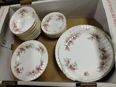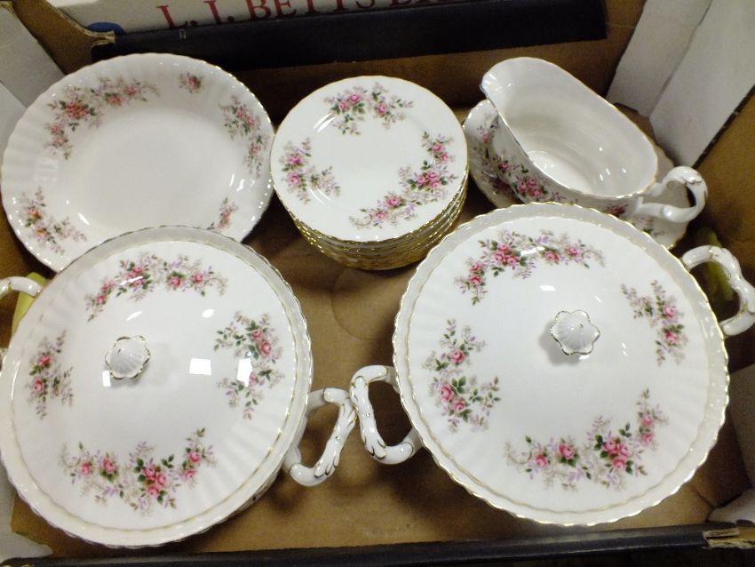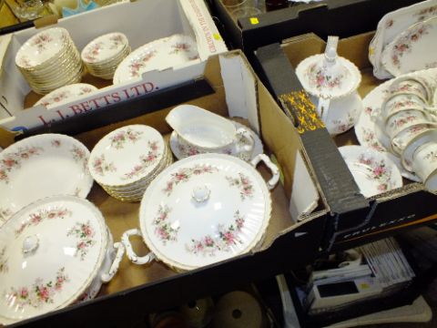 THREE TRAYS OF ROYAL ALBERT LAVENDER ROSE TEA AND DINNER WARE TO INCLUDE LIDDED TUREENS