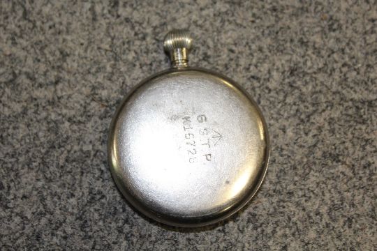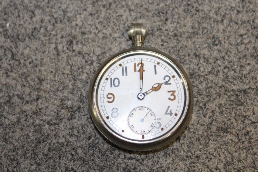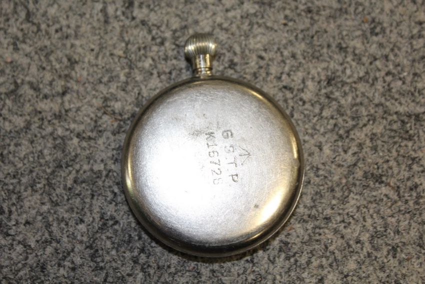 A TRAY OF METALWARE TO INCLUDE BRASS CANDLESTICKS, NAPKIN RINGS ETC. TO INCLUDE A MILITARY POCKET WATCH (A/F - GLASS MISSING)