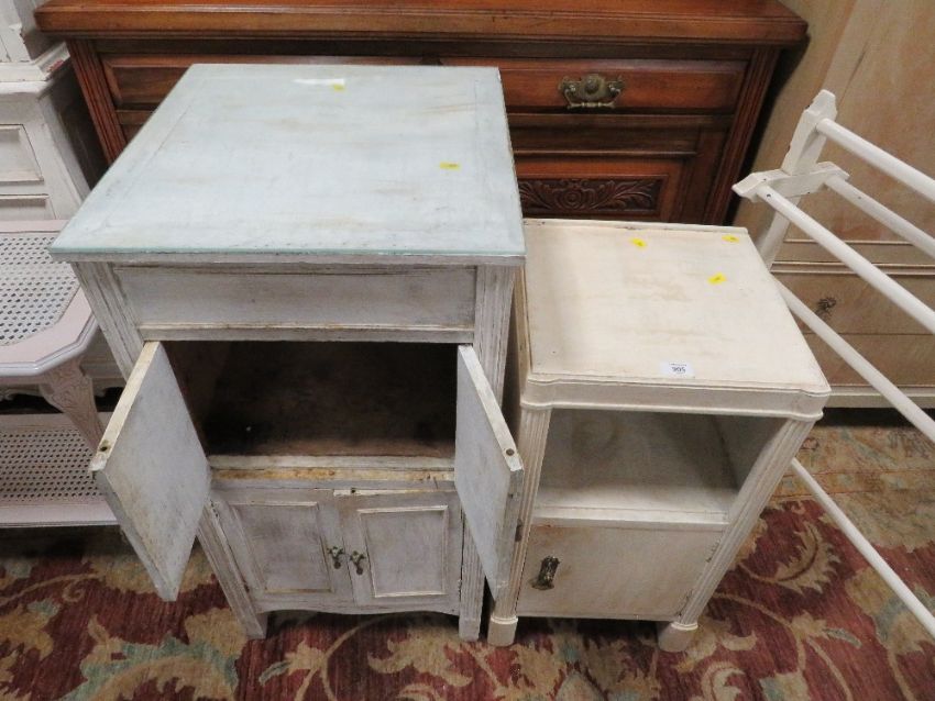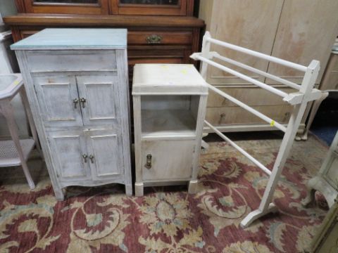 A VINTAGE SHABBY CHIC STYLE OLD GRAMOPHONE CABINET, BEDSIDE CABINET AND TOWEL RAIL (3)