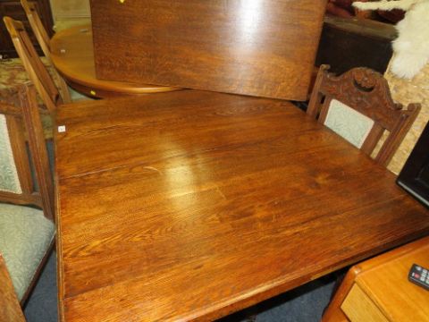 AN EDWARDIAN OAK EXTENDING DINING TABLE WITH ONE LEAF TOGETHER WITH FOUR CARVED OAK CHAIRS