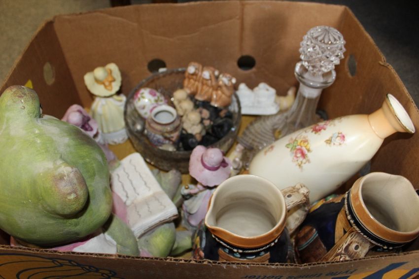 A BOX OF ASSORTED CERAMIC FIGURES ETC.