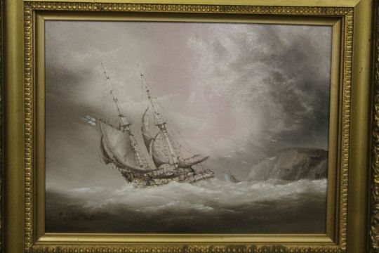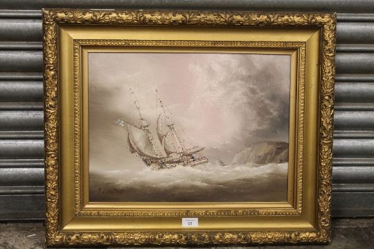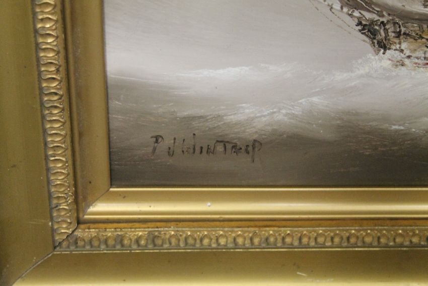 A GILT FRAMED OIL ON BOARD OF A SAIL SHIP ON CHOPPY WATERS SIGNED LOWER LEFT P J WINTRIP, H 35.5 CM BY W 48 CM