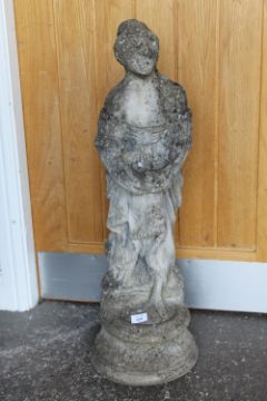 A STONE GARDEN FIGURE OF A FEMALE HOLDING A BIRD, H 82 CM