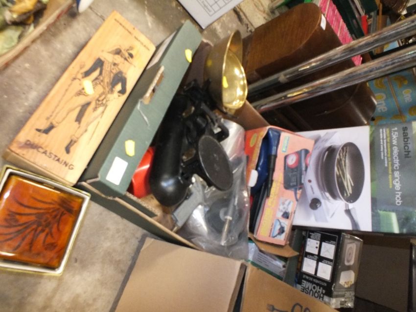 A TRAY OF HOUSEHOLD SUNDRIES TO INCLUDE AN ELECTRIC SINGLE HOB, VINTAGE SCALES ORIENTAL BOXES ETC