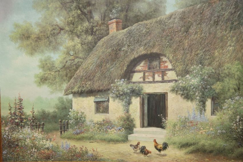 A LARGE GILT FRAMED OIL ON CANVAS DEPICTING CHICKENS BEFORE A THATCHED COTTAGE SIZE - 91.5CM X 61CM