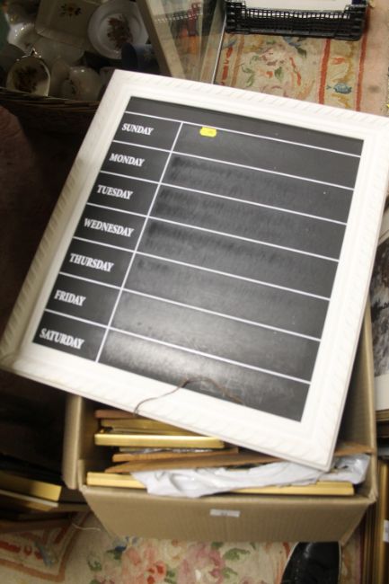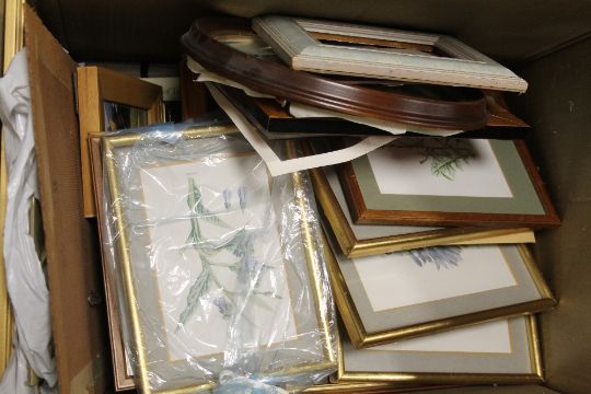 A BOX OF PICTURE FRAMES AND PRINTS ETC
