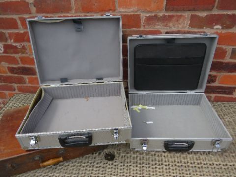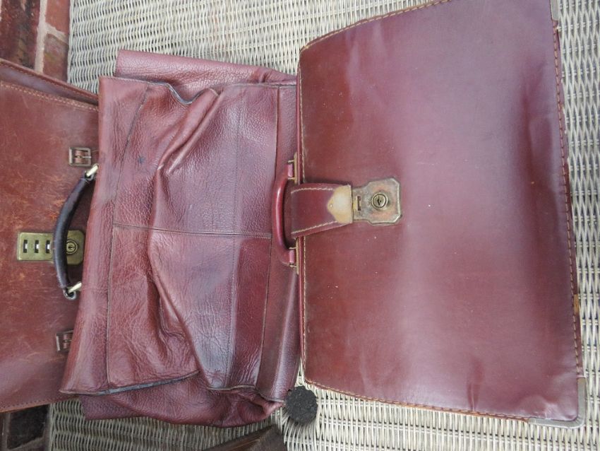 A SELECTION OF FOUR VINTAGE LEATHER BRIEFCASES, TWO ALUMINIUM CASES AND A WOODEN CASED DUPLICATOR