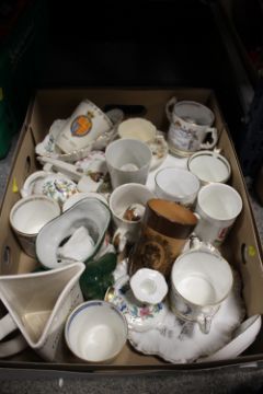 A TRAY OF COMMEMORATIVE CERAMICS TO INCLUDE A ROYAL DOULTON STONEWARE CUP, AYNSLEY ETC.