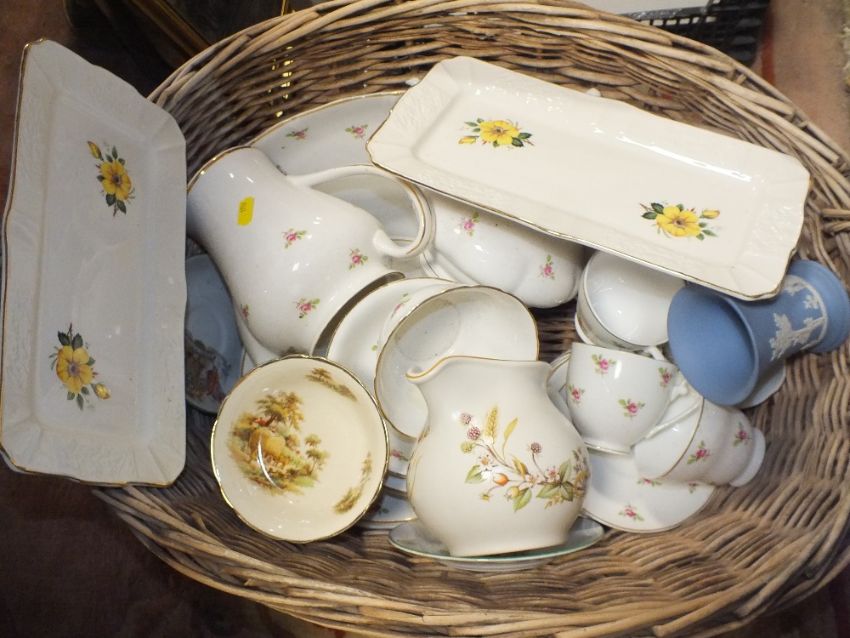 A TWIN HANDLED LOG BASKET OF CHINA AND CERAMICS TO INCLUDE DENBRO, WEDGWOOD JASPERWARE ETC