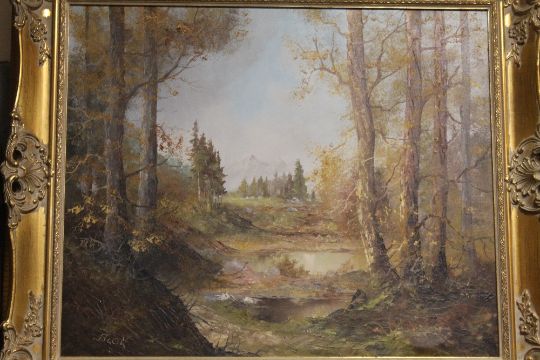 A GILT FRAMED OIL ON CANVAS OF A MOUNTAINOUS WOODED LANDSCAPE - OVERALL SIZE - 66CM X 75CM