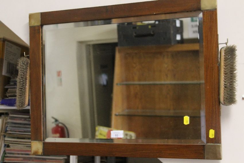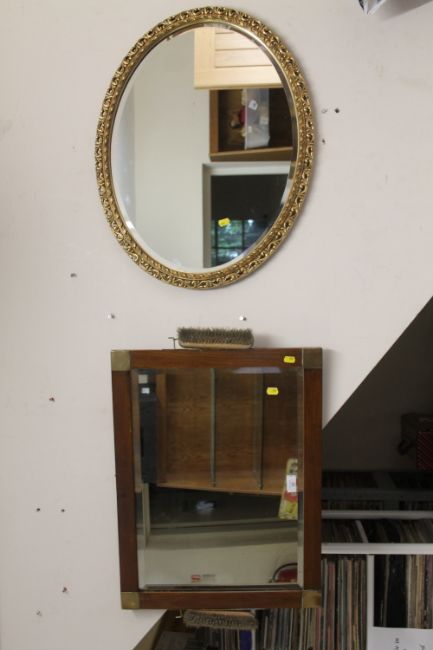AN EDWARDIAN STYLE BEVEL EDGED DRESSING MIRROR COMPLETE WITH TWO BRUSHES TOGETHER WITH A GILT FRAMED OVAL EXAMPLE (2)
