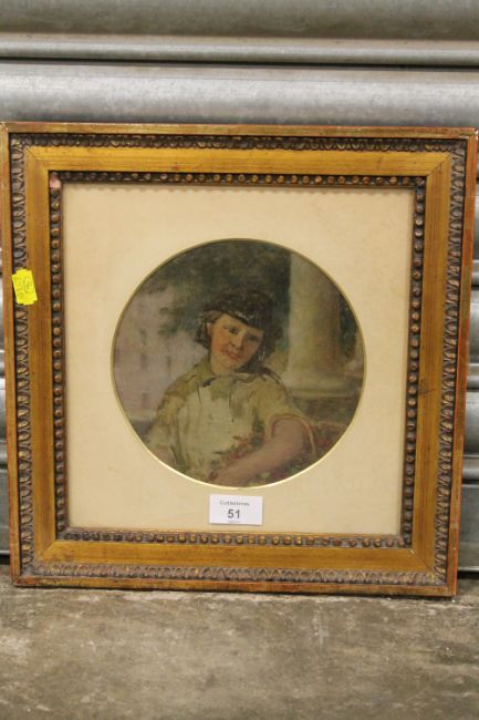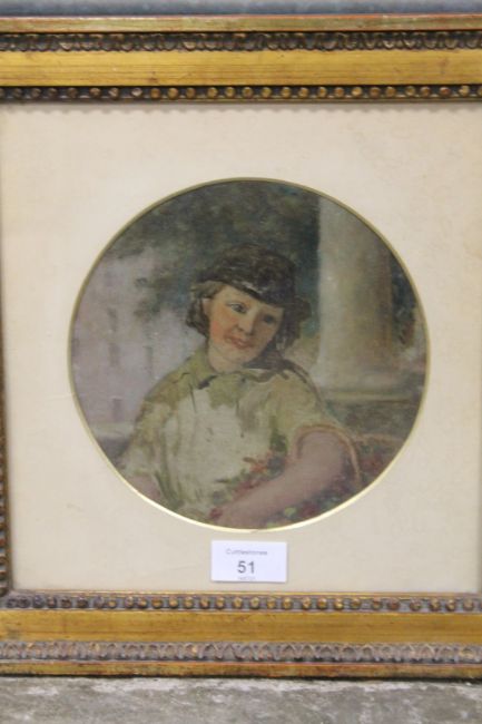 (XIX). Circular study of a flower seller before a building, unsigned, oil on canvas laid on board, framed and glazed, diameter 17 cm