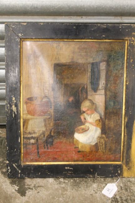 (XIX) ENGLISH SCHOOL. Cottage interior scene with young girl peeling vegetables, and a black cat, unsigned, oil on canvas, framed, 34 x 28 cm