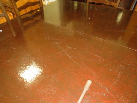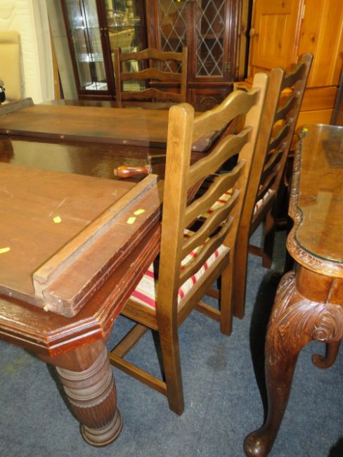 A LARGE EDWARDIAN MAHOGANY DINING TABLE WITH SIX MODERN DINING CHAIRS, AS FOUND, VARNISHED TOP