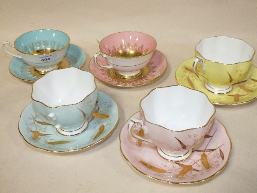 TWO ROYAL GRAFTON CUPS AND SAUCERS WITH HAND PAINTED FRUIT DECORATION TO INTERIOR, TOGETHER WITH THREE OTHER QUEEN ANNE CUPS AND SAUCERS (ONE WITH BROKEN HANDLE)