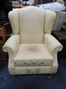 A MODERN UPHOLSTERED WING ARMCHAIR - A/F STAINED TO THE SEAT