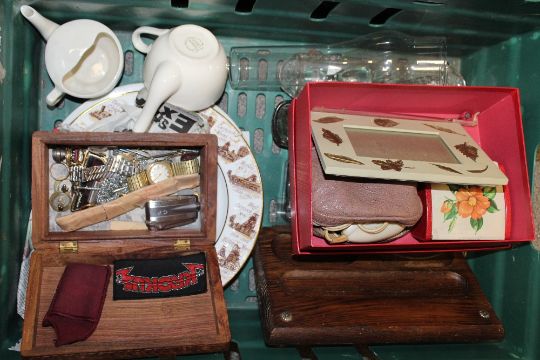 A TRAY OF COLLECTABLES TO INCLUDE OIL LAMP FLUES, WRIST WATCH, AND VINTAGE LIGHTERS TOGETHER WITH A REPRODUCTION WALL CLOCK (PLASTIC TRAY NOT INCLUDED)