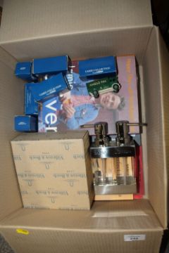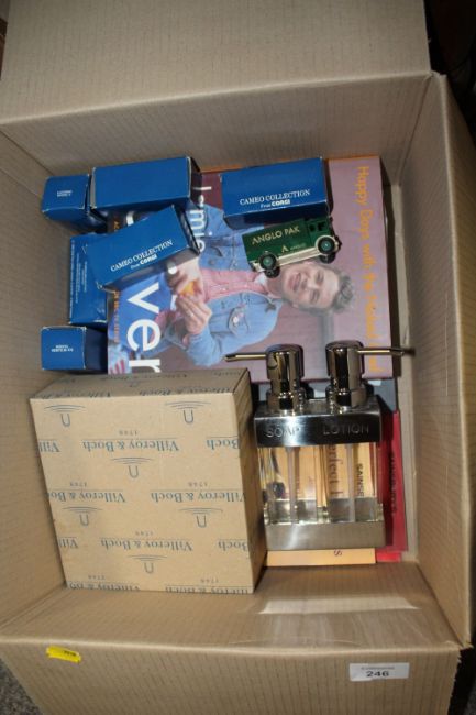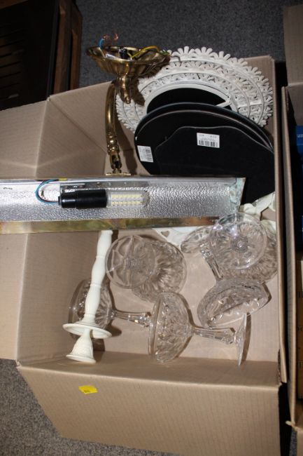 A QUANTITY OF HOUSEHOLD SUNDRIES TO INCLUDE CORGI CAMEO COLLECTION TOY CARS, BRASS PICTURE LIGHT ETC.