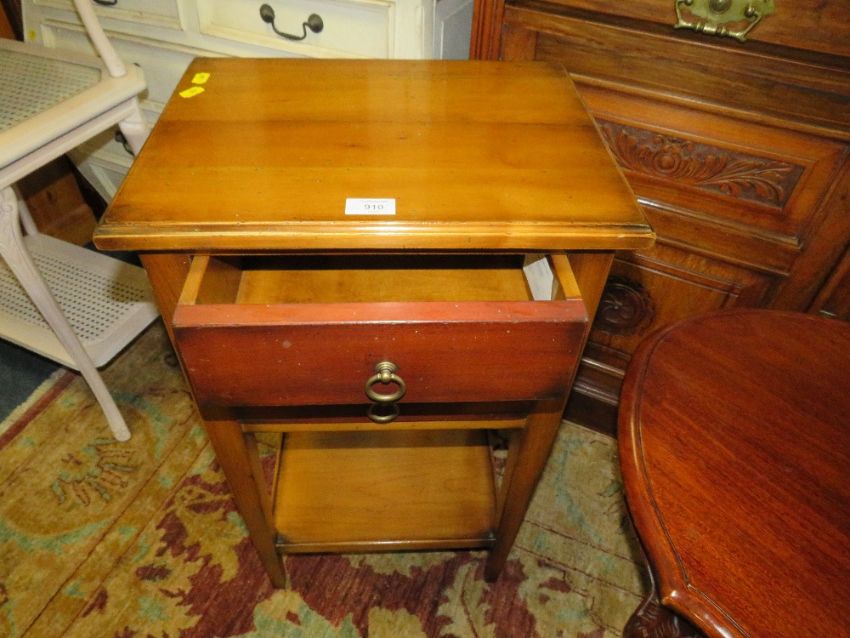 A SMALL CHERRYWOOD TWO DRAWER CABINET W-43 CM TOGETHER WITH A FRENCH STYLE COFFEE TABLE (2)