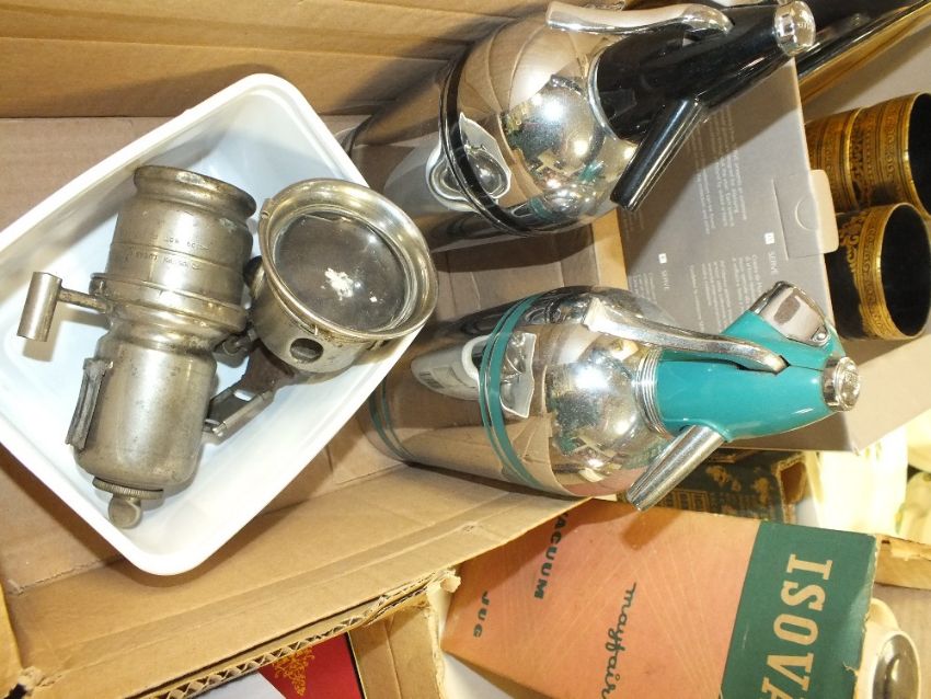 TWO VINTAGE SODA SIPHONS TOGETHER WITH A VINTAGE VACUUM JUG AND A BIKE LAMP