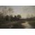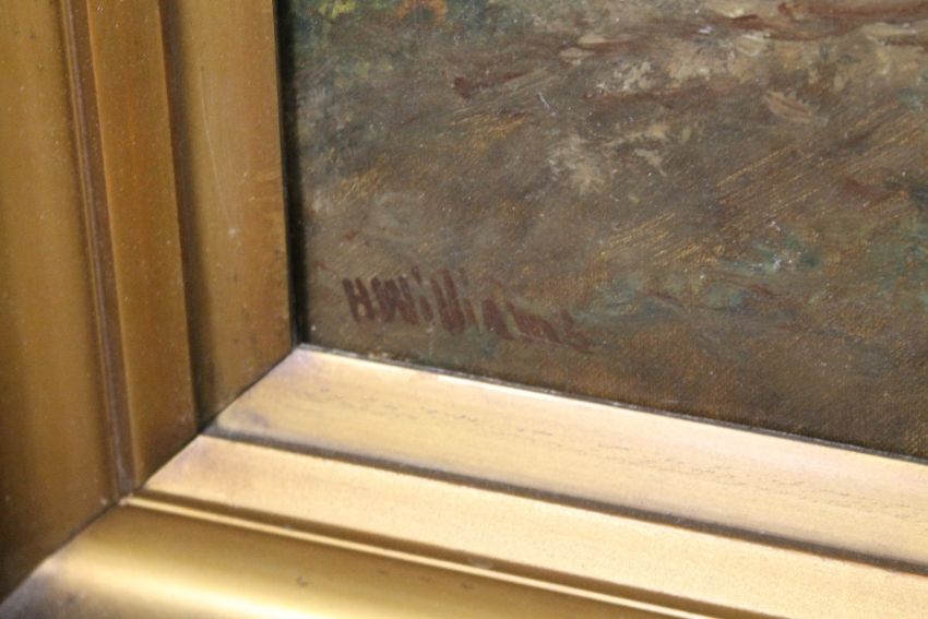 H. WILLIAMS (XIX-XX). Wooded river landscape at twilight with figures, church and haystack, signed lower left, oil on canvas, framed, 40 x 60 cm
