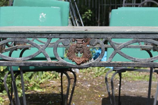 A GLASS TOPPED METAL FRAMED GARDEN TABLE WITH FOUR CHAIRS