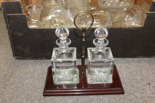 A TRAY OF ASSORTED GLASSWARE TO INCLUDE A SMALL TWO DECANTER CARRIER