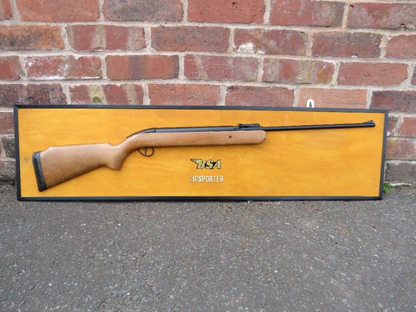 A WALL MOUNTED AIR RIFLE SHOP DISPLAY ADVERTISING SIGN FOR THE BSA AIRSPORTER L 122 CM, H 30 CM