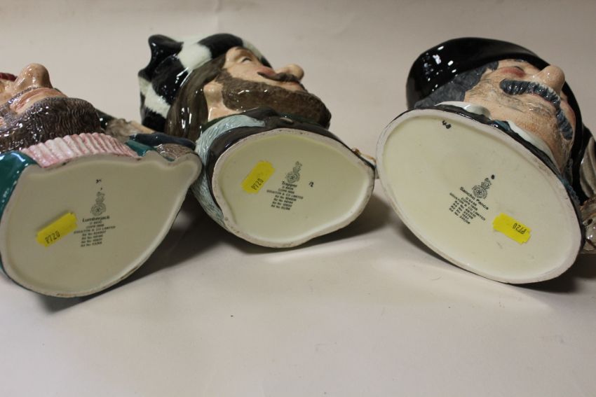 THREE ROYAL DOULTON CHARACTER JUGS - TRAPPER, LUMBERJACK AND SANCHO PANCA