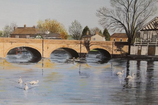 A FRAMED AND GLAZED ACRYLIC OF THE BOATHOUSE AND TRAMWAY BRIDGE IN STRATFORD UPON AVON BY BRIAN GARMAN H 19.5 CM BY W 50 CM