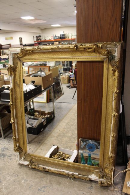 A LARGE 19TH CENTURY GOLD DECORATIVE SWEPT FRAME - WITH DAMAGES, frame W 17 cm, rebate 120 x 97 cm