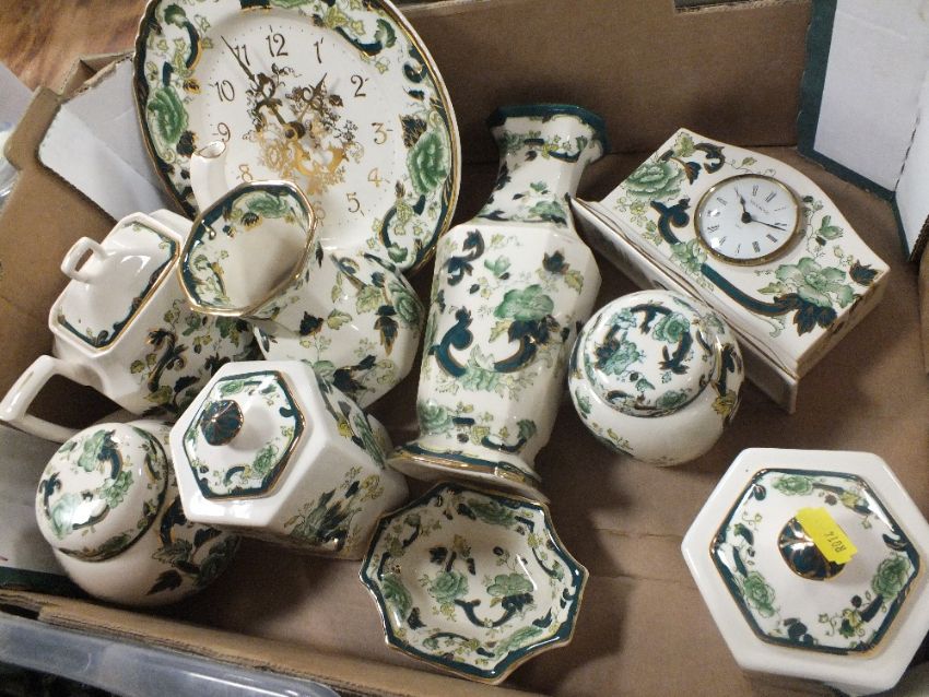 A COLLECTION OF MASONS CHARTREUSE CERAMICS TO INCLUDE A TEAPOT, CLOCKS, VASES ETC. (10 PIECES IN TOTAL)
