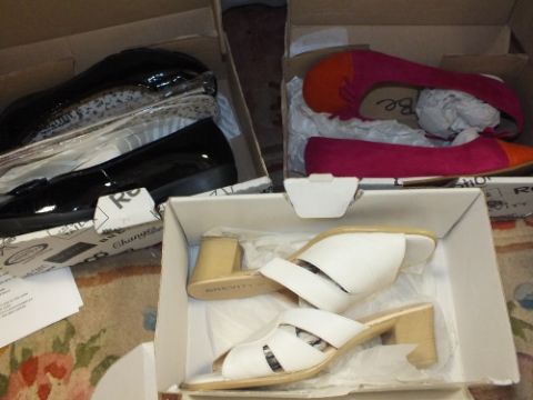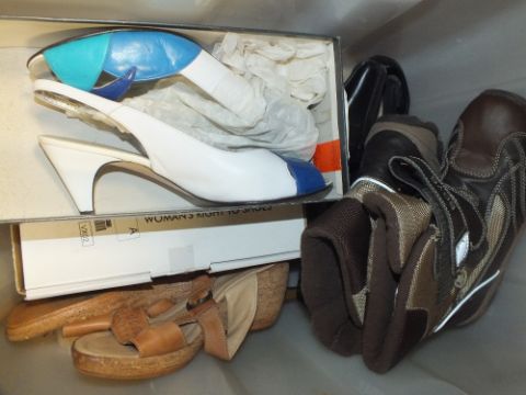 A LARGE QUANTITY OF BOXED LADIES SHOES, CURTAINS ETC