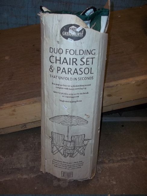 A BOXED FOLDING CHAIR AND PARASOL SET