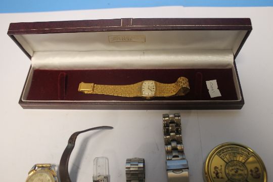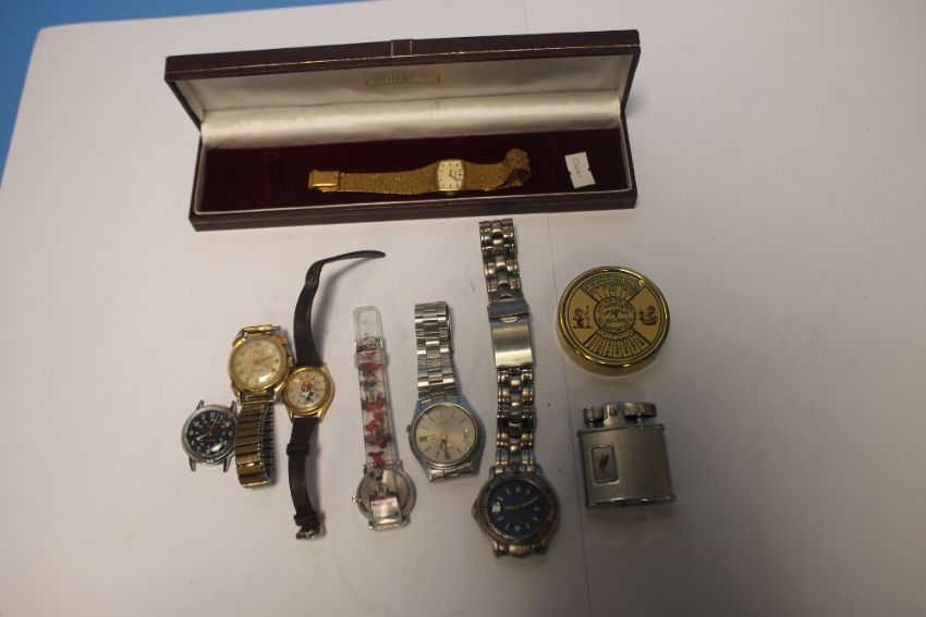 A BOX OF COLLECTABLES TO INCLUDE 7 WATCHES,LIGHTER AND A BRASS CALENDAR