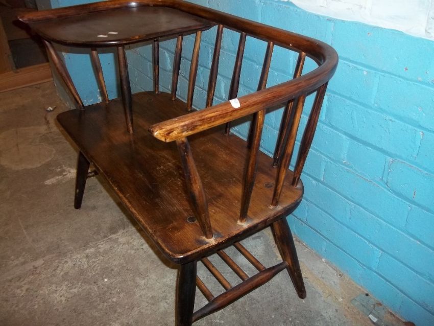 A WOODEN VINTAGE TELEPHONE BENCH SEAT IN THE STYLE OF ERCOL