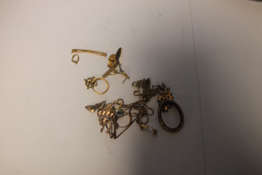 A ORIENTAL STYLE DISH AND A BOX OF YELLOW METAL ITEMS
