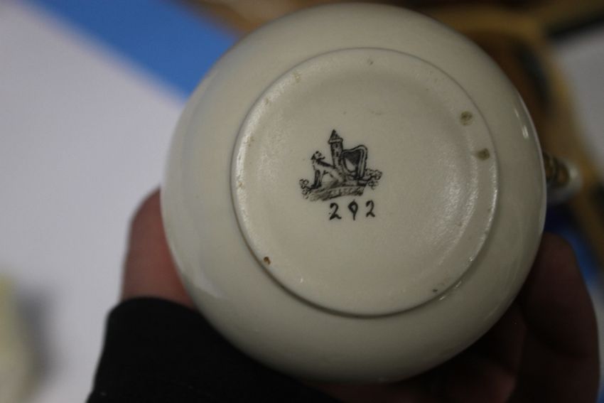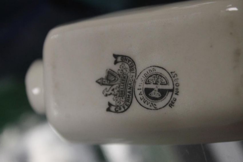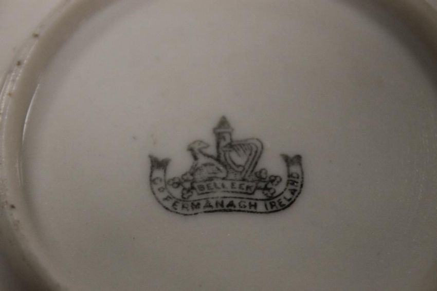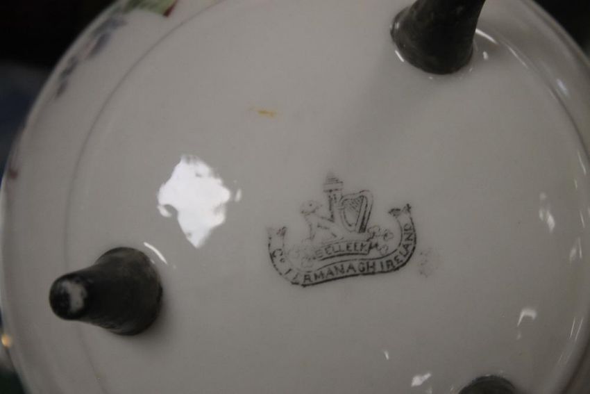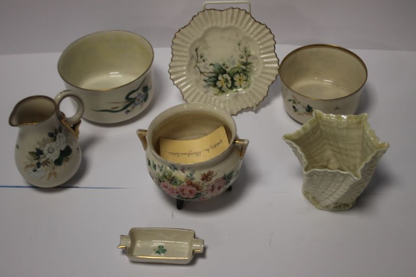 SEVEN BELLEEK ITEMS, TO INCLUDE AN UNUSUAL THREE LEGGED POT, JUG, PLATE, THREE BOWLS ETCALL WITH BLACK STAMP TO THE BASE Condition Report:  There is slight rubbing to the gilding, some staining and slight crazing but no other obvious damage or restoration