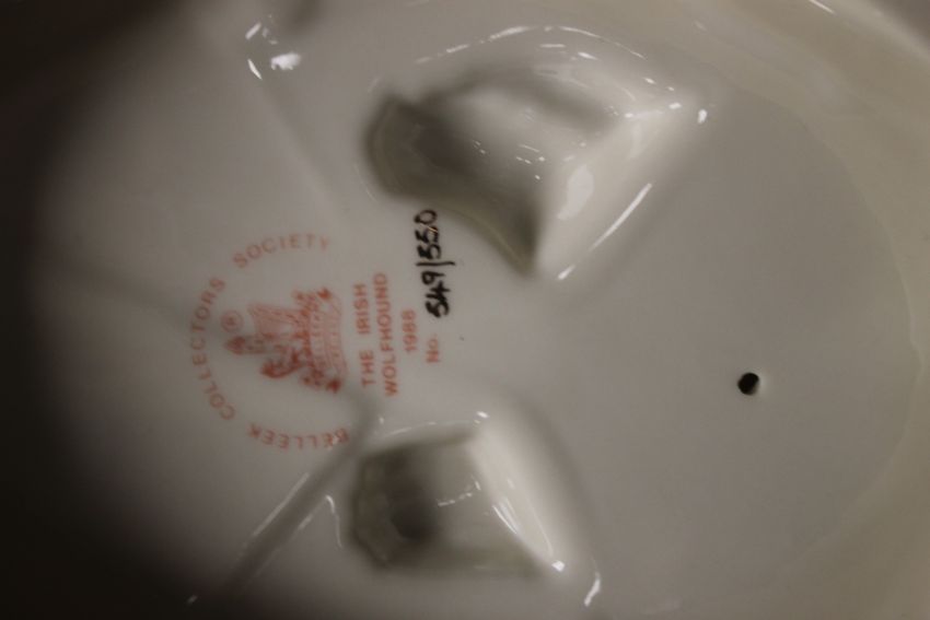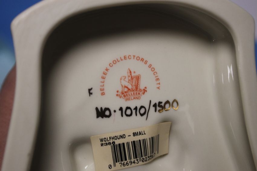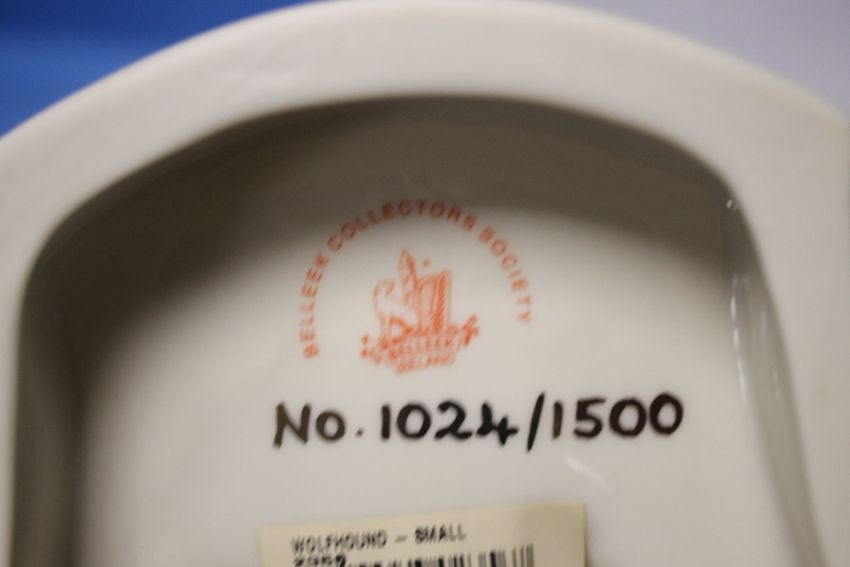 A BELLEEK COLLECTORS SOCIETY IRISH WOLFHOUND TOGETHER WITH A MATCHED PAIR OF SMALLER IRISH WOLFHOUNDS ALL WITH RED MARKS TO BASE