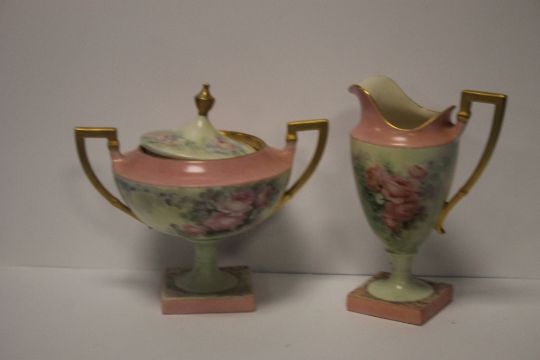 A BELLEEK TWIN HANDLED LIDDED VASE WITH PINK ROSE DECORATION TOGETHER WITH A SIMILAR JUG