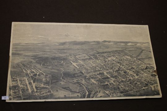 A MOUNTED BIRDS EYE VIEW PRINT OF A TOWN BY S CALVERT 98 CM X 55 CM