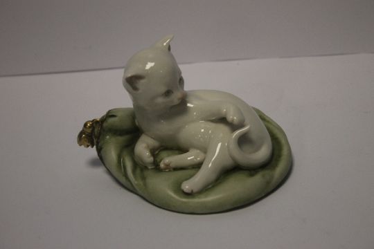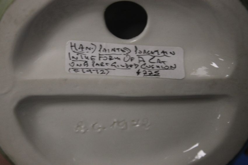 A HAND PAINTED PORCELAIN FIGURE IN THE FORM OF A CAT ON A PART GILDED CUSHION