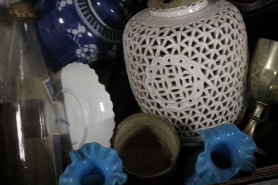 TWO TRAYS OF ASSORTED CERAMICS TO INCLUDE BLUE AND WHITE ETC (TRAYS NOT INCLUDED)