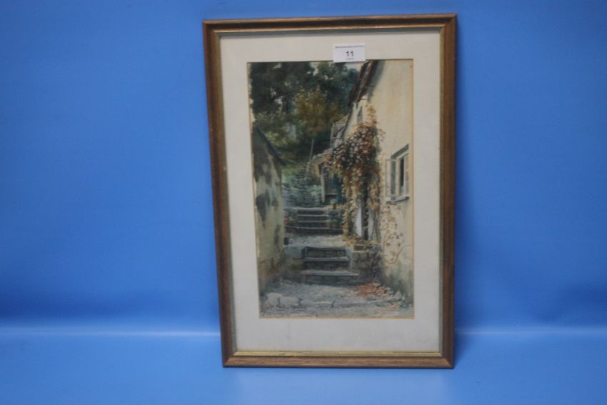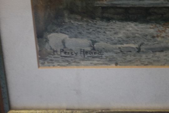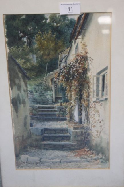 H PERCY HEARD FRAMED AND GLAZED WATERCOLOUR OF A COTTAGE AND GARDEN SIGNED LOWER LEFT 30 CM X 44.5 CM