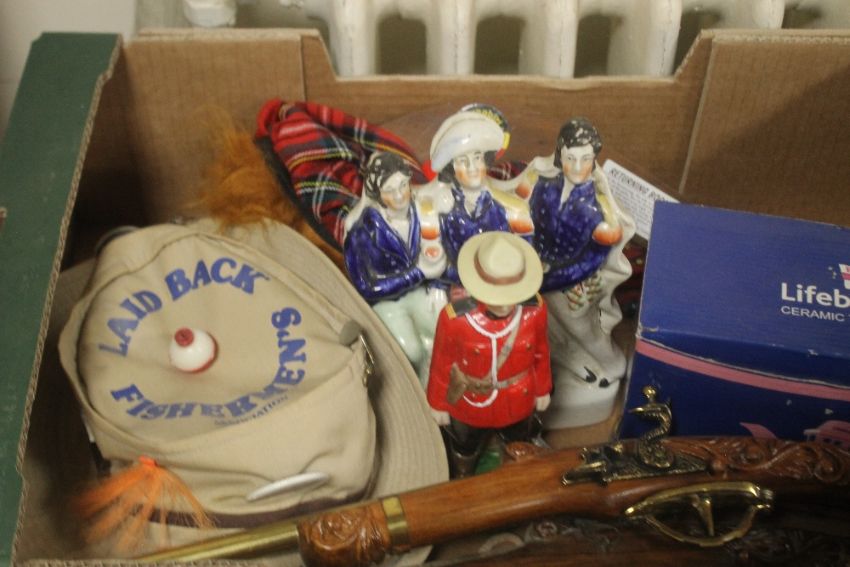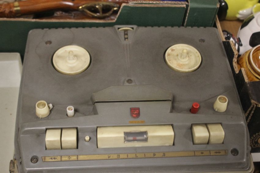 A TRAY OF SUNDRIES TO INCLUDE A PAIR OF PISTOLS AND A PHILLIPS REEL TO REEL