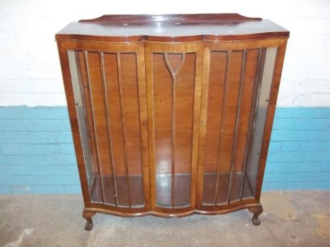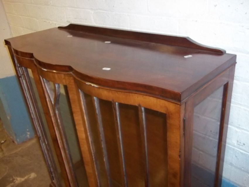 A VINTAGE SERPENTINE FRONTED CHINA DISPLAY CABINET (ONE CRACKED GLASS PANE)
