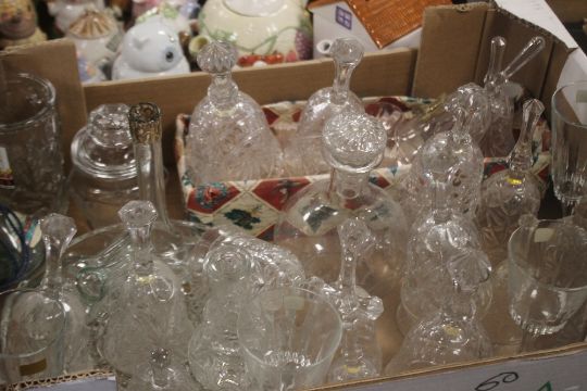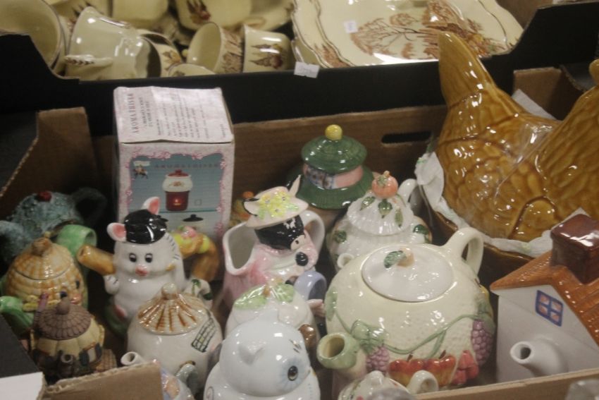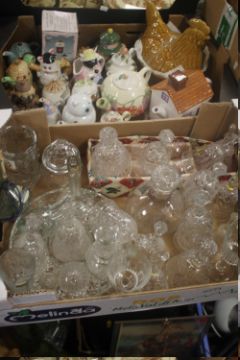 A TRAY OF GLASSWARE TOGETHER WITH A TRAY OF TEAPOTS