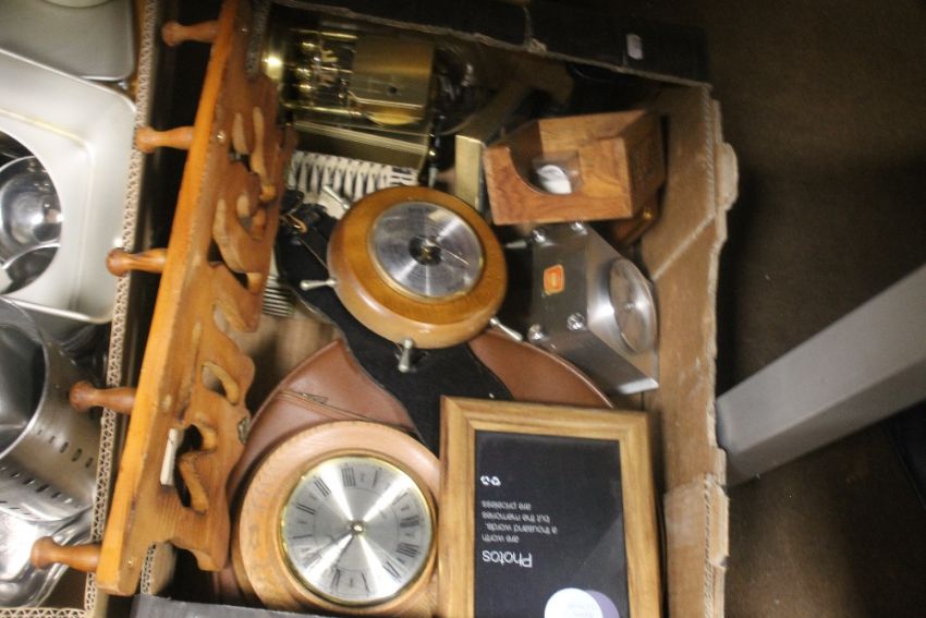 A TRAY OF ASSORTED METALWARE TOGETHER WITH A TRAY OF TREEN (TRAYS NOT INCLUDED)