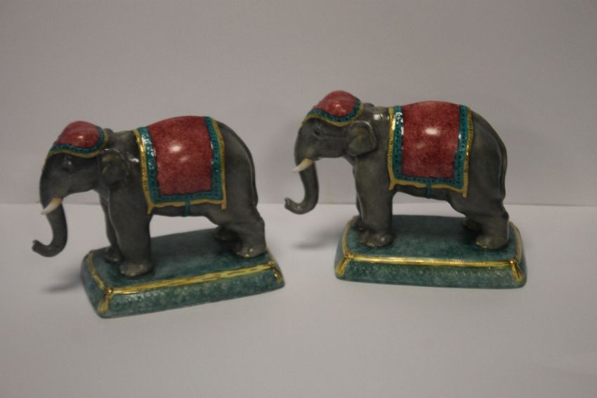 A PAIR OF HALCYON DAYS INDIAN ELEPHANTS, 10.5 x 11 x 6 cm Condition Report: A miniscule chip to one ear and a very small defect on one trunk possibly in manufacturing as under paintwork